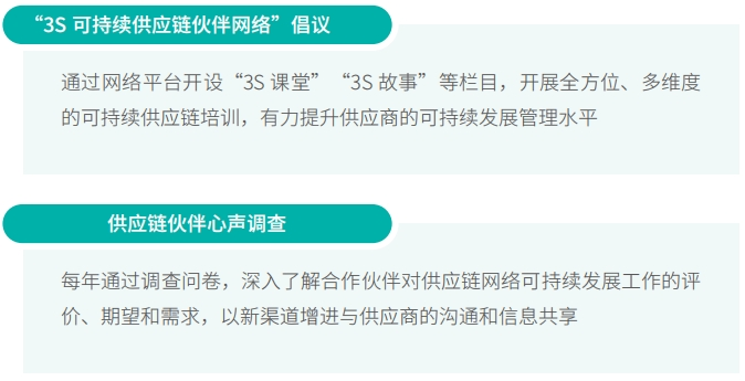 我们开发可持续供应链培训包,重视供应商的发展与培养,通过举办培训、分享最佳实践等方式,帮助内部采购人员和外部供应商提升可持续采购意识与能力,实现企业与供应商之间的长期价值创造和成效共享。