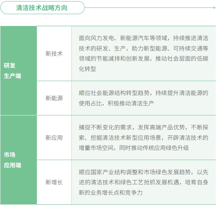我们立足新材料环保可再生的特点和高端产品优势,持续挖掘清洁技术新型应用场景,同时把握产业结构调整带来的清洁技术的机遇,实现清洁技术相关业务的不断增长,推动企业自身和相关产业绿色低碳转型。